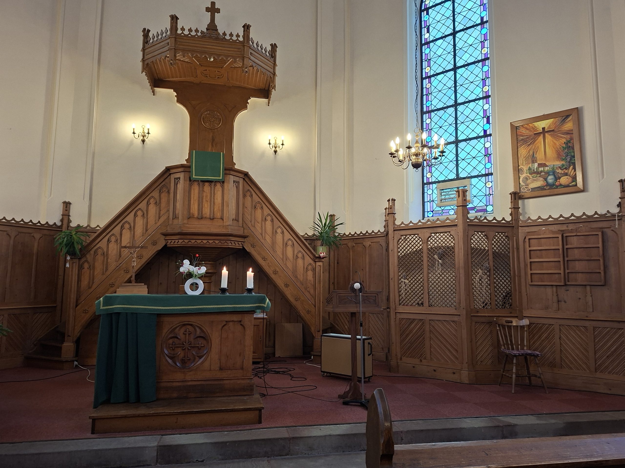 La particularité du temple réside dans sa chaire, composée de deux escaliers (voir photo).